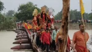 मुजफ्फरपुर जिले के कटरा में बागमती नदी के पीपा पुल पर इन दिनों एक वीडियो वायरल हो रहा है, जिसमें ग्रामीण श्रद्धालुओं की टोलियां मां दुर्गा समेत अन्य देवी-देवताओं की प्रतिमाएं कांधे पर उठाकर नदी पार करती नजर आ रही हैं।